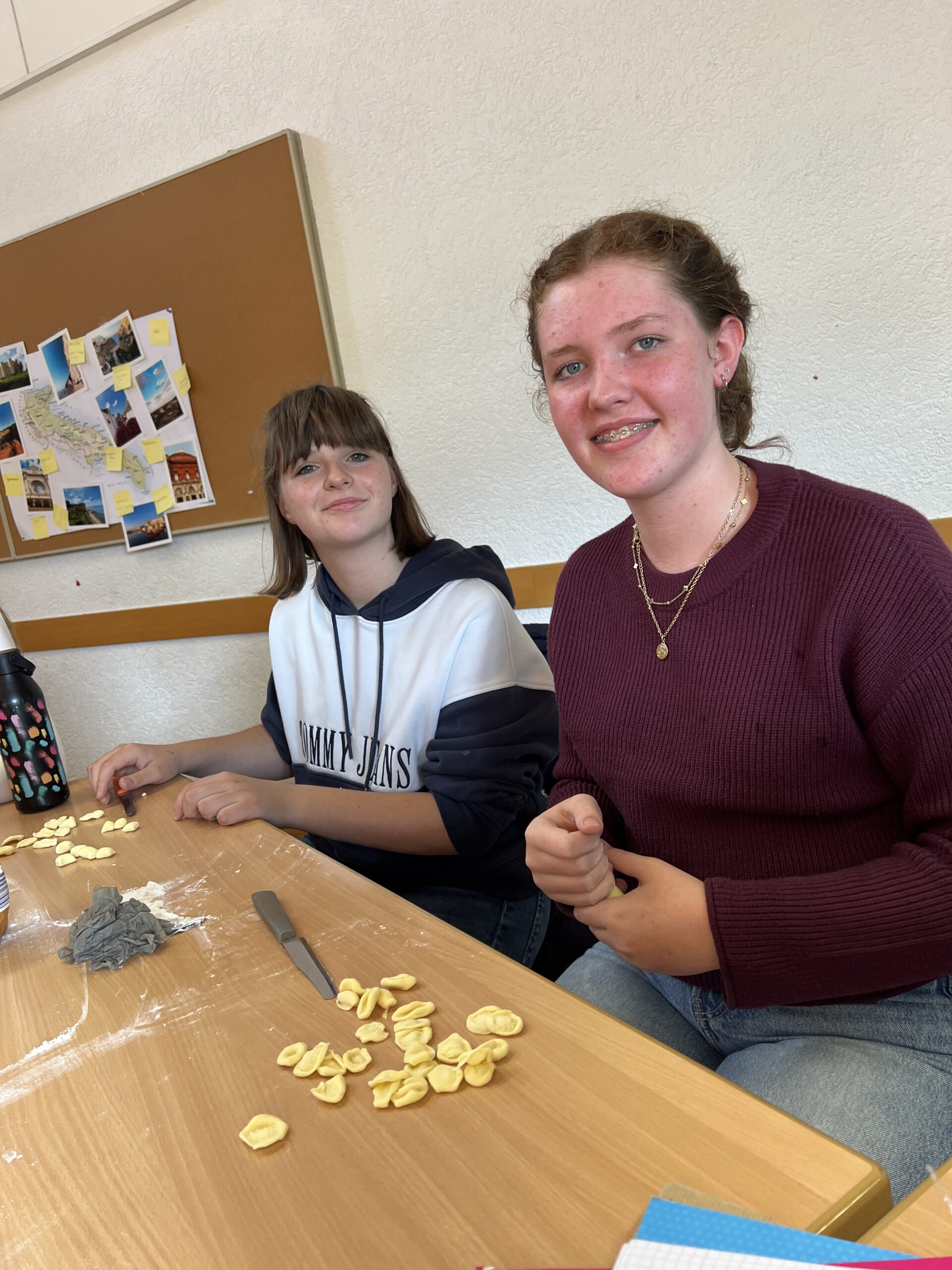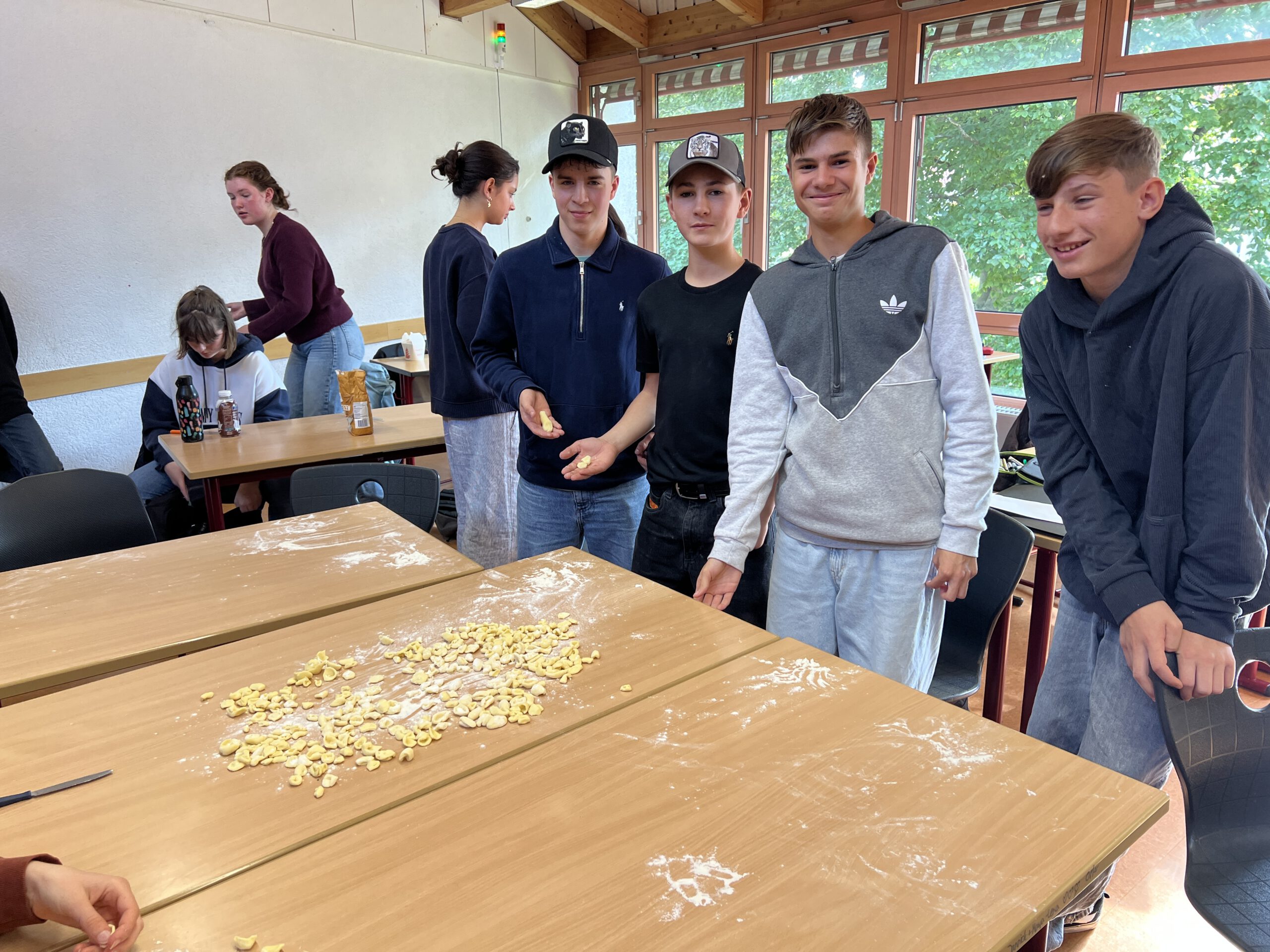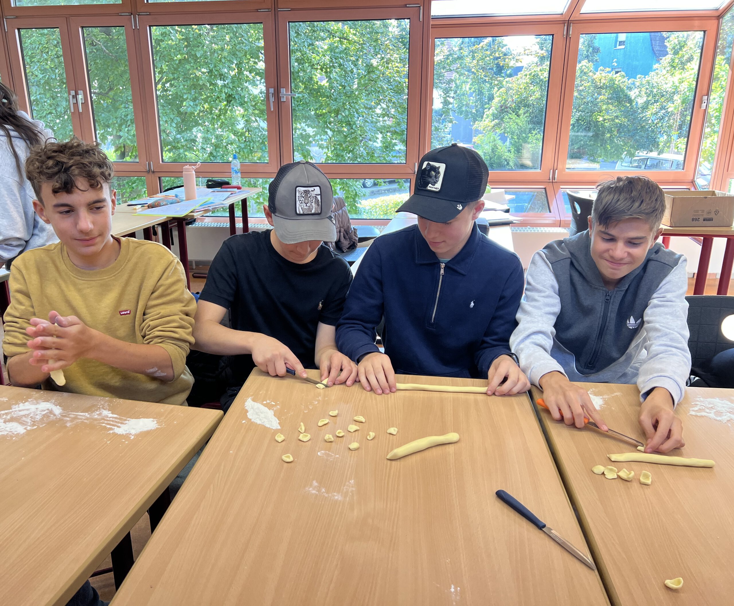 Im Unterricht hat uns Frau Facchini erzählt, dass Orecchiette eine traditionelle Pastasorte aus Apulien sind – mit besonderem Enthusiasmus, da sie selbst aus Apulien kommt. Mit Hartweizengrießmehl und Wasser hat sie den Teig vorbereitet und fertig in den Unterricht mitgebracht, damit wir ihn gleich zu Orecchiette formen konnten. Sie hat uns dann gezeigt, wie man den Teig zu Orecchiette formt. Danach waren wir dran! Bei Frau Facchini sah es total leicht aus, aber bei uns sahen die Orecchiette am Anfang eher wie kleine Klumpen aus. Mit ein bisschen Übung und viel Geduld wurden unsere Orecchiette immer besser. Am Ende konnten wir richtig stolz auf unsere Pasta sein. Viele Schüler haben ihre Pasta mitgenommen, um sie zu Hause selbst zu kochen.