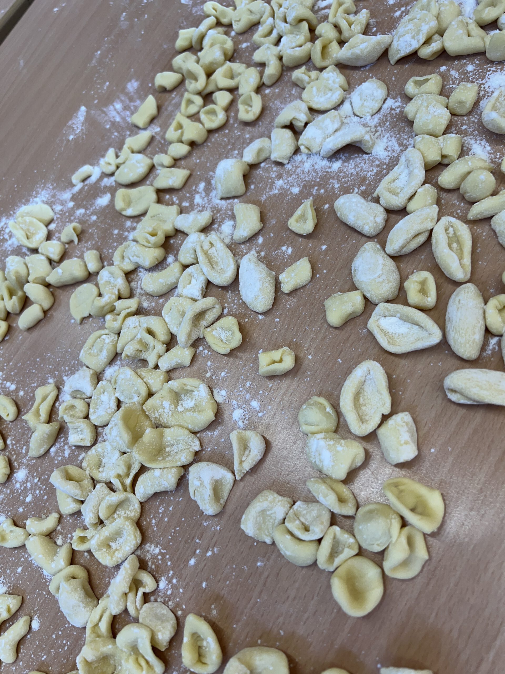 Am Anfang des Jahres haben wir im Italienischunterricht etwas ganz Besonderes gemacht: Wir haben selbst Orecchiette, also kleine italienische Nudeln, hergestellt.