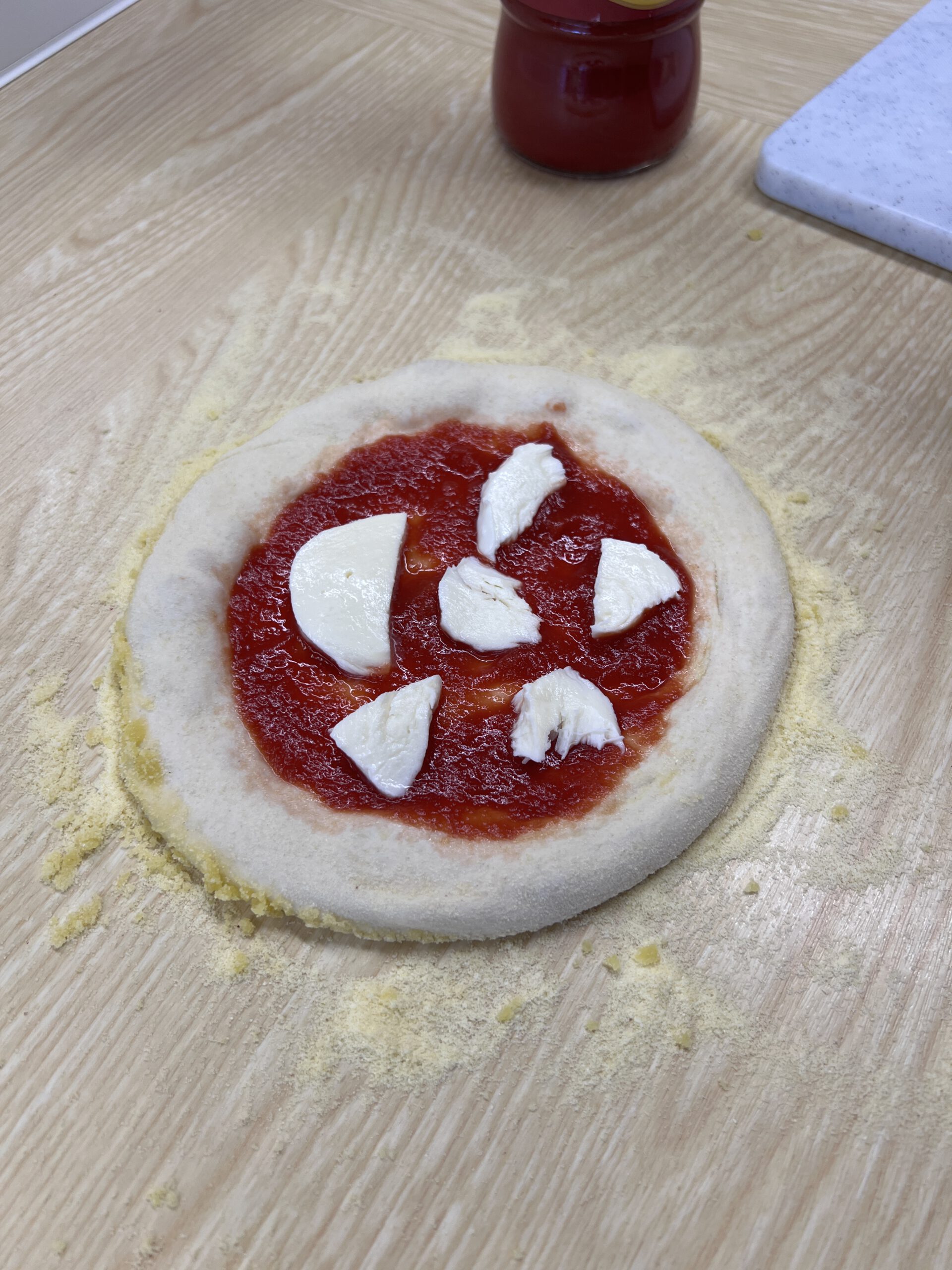Zu Beginn erhielten die Schülerinnen und Schüler eine kurze Einführung in die Grundlagen der Pizzaherstellung. Der Pizzateig basiert auf einer sogenannten Biga, einem Vorteig, der bereits am Vortag angesetzt worden war. Die einzelnen Teigballen wurden dann von den Schülerinnen und Schülern vorsichtig leicht flachgedrückt und mit Tomatensoße sowie Mozzarella belegt.