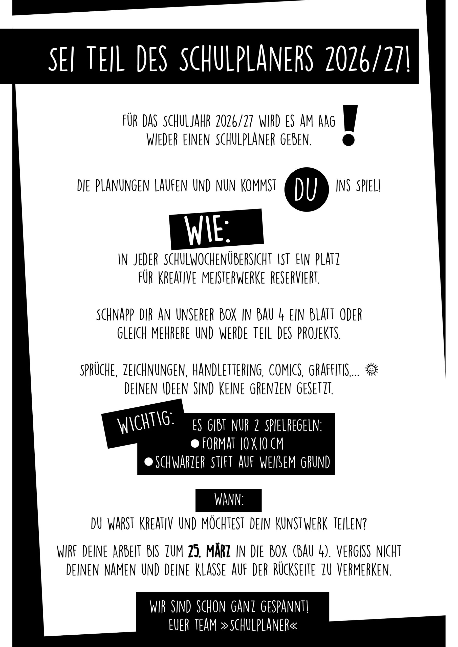 Die kreativen, mutmachenden oder einfach lustigen Bildchen in den Ecken der Planer-Seiten kommen hingegen immer direkt aus der Schülerschaft. Wenn du auch einen kreativen Teil zum neuen Schulplaner 2026/27 beitragen möchtest, findest du alle dafür wichtigen Infos hier auf diesem Flyer: