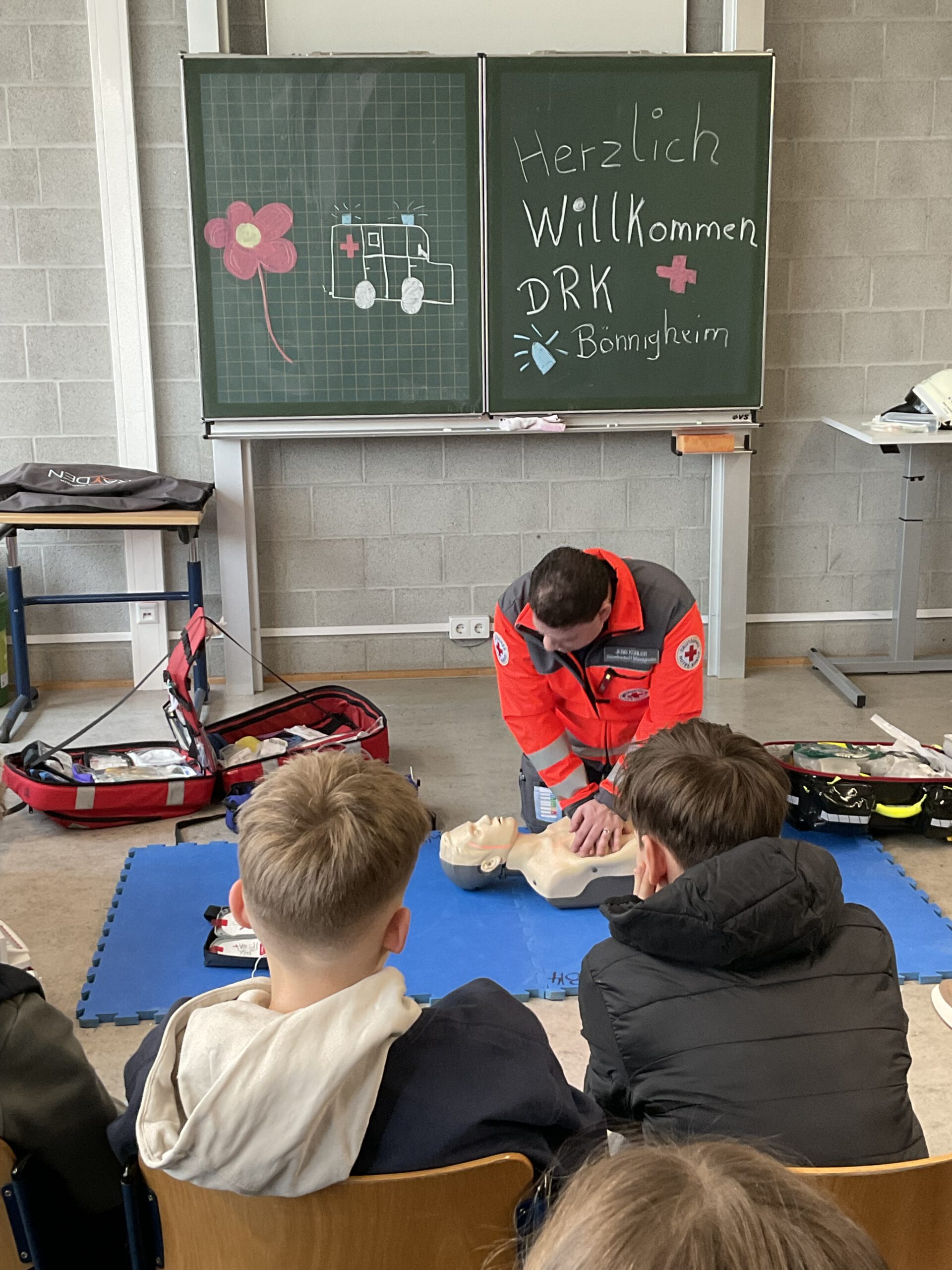 Im Anschluss an diese Präsentation in der Aula durften die Sechstklässler auch selbst bei einem Stationenlauf aktiv werden. So erhielten sie bei den beiden AAG-Lehrerinnen Ingrid Schwahn und Johanna Gase sowie ihren Schülerinnen und Schülern des Schulsanitätsdienstes eine Einweisung in das korrekte Anlegen von Druckverbänden, übten die stabile Seitenlage und das Absetzen eines Notrufes. Beim DRK bekamen sie unter anderem einen Einblick in den Inhalt des Notfallrucksacks und der Tasche. An einem Modell wurde zudem die so wichtige Herz-Lungen-Wiederbelebung demonstriert.