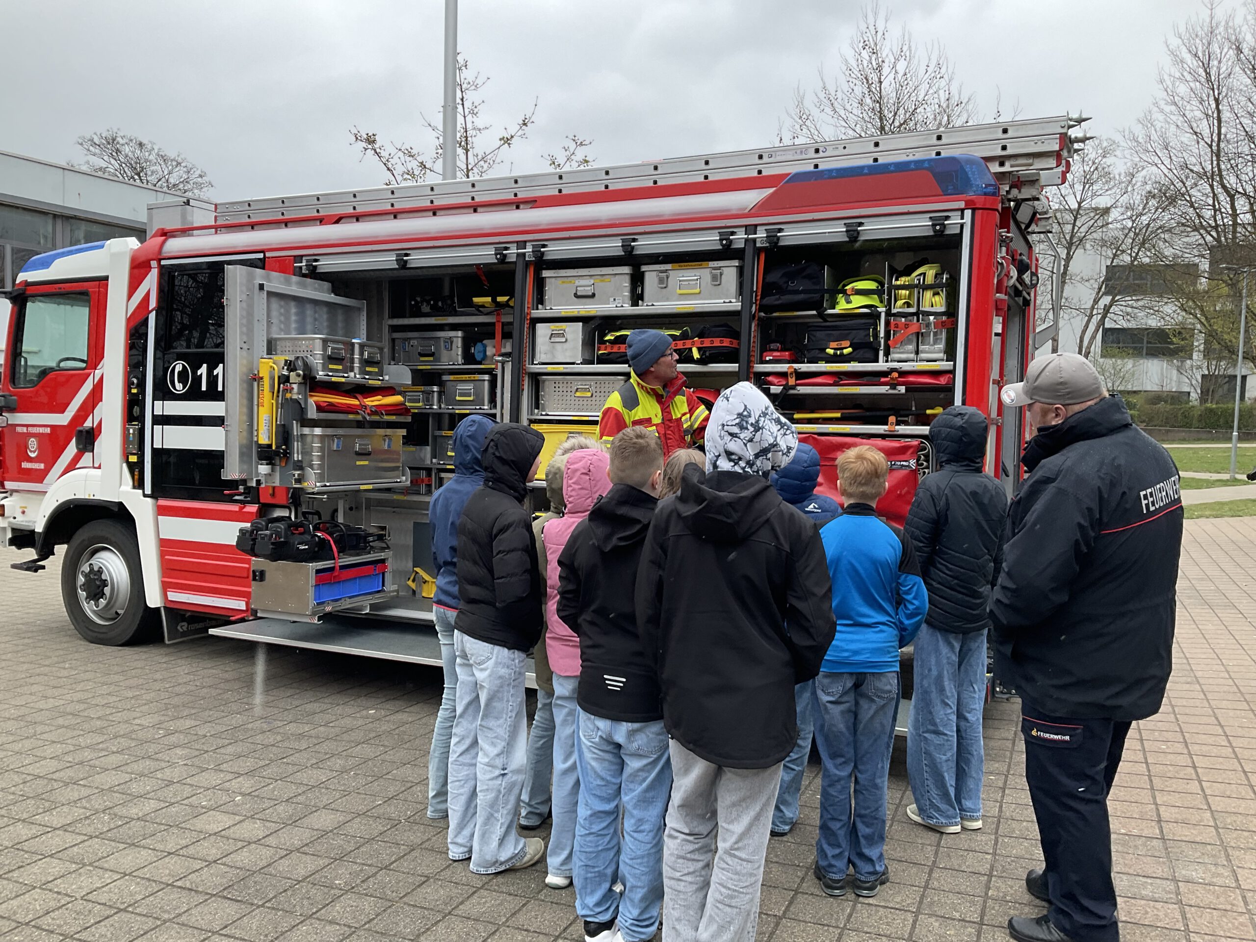 Am Stand der Feuerwehr zeigten sich die Schüler sichtlich beeindruckt von der Schutzkleidung und der Ausstattung des Einsatzfahrzeuges. Mitschüler mussten in einer Trage gemeinsam über den Schulhof befördert werden, und beim Befüllen von Sandsäcken als Hochwasserschutzmaßnahme wurde ebenfalls tatkräftig Hand angelegt.