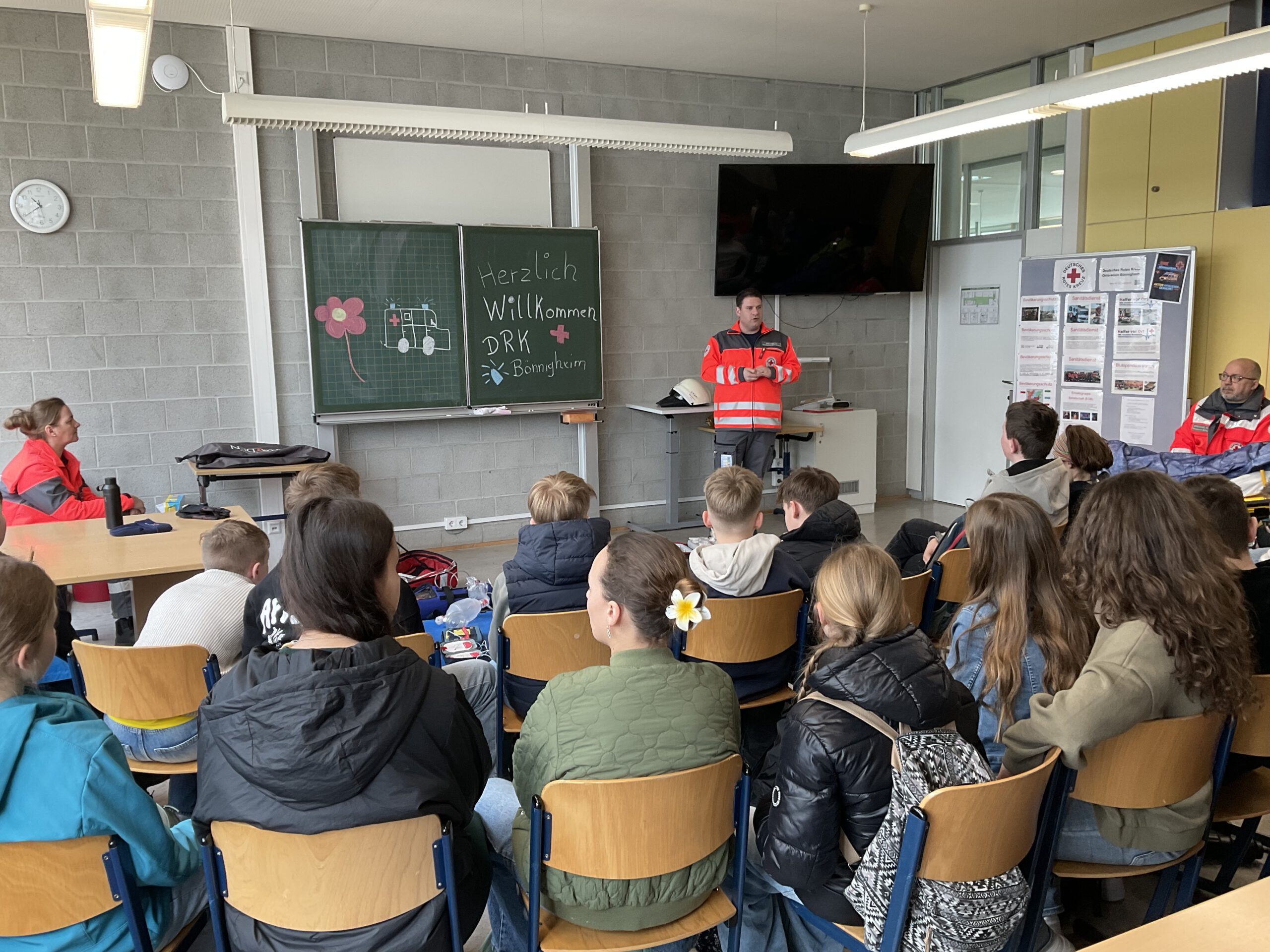 Nach einer kurzen Begrüßung des stellvertretenden Schulleiters Sven Schmitt informierten Feuerwehrkommandant Mike Etzel und DRK-Bereitschaftsleiter Jens Kübler und ihre Teams die 130 anwesenden Schülerinnen und Schüler über ihre Organisationen sowie deren Aufgaben beim Bevölkerungsschutz und speziell im Katastrophenfall. Was dabei genau eine Katastrophe von einem Notfall unterscheidet, wurde ebenso erklärt wie die Frage, wie die Bevölkerung durch Sirenen, die NINA-Warn-App oder das Radio bei einem Katastrophenfall frühzeitig gewarnt werden kann.