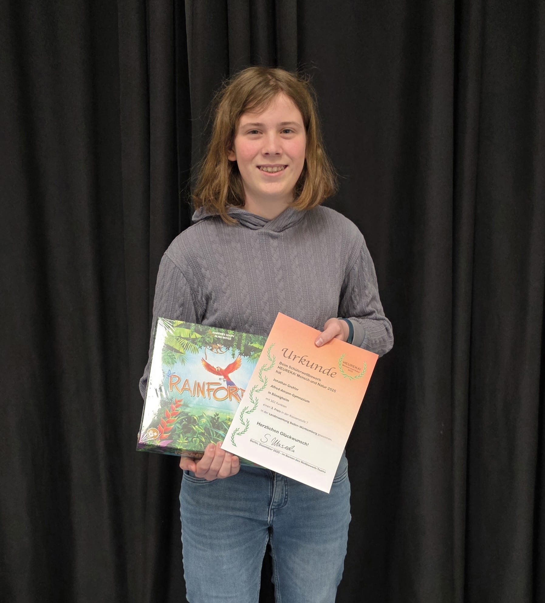 Herzlichen Glückwunsch an Jonathan Gruhler: Mit seinem Erfolg beim diesjährigen Heureka!-Wettbewerb Mensch und Natur gelang ihm der verdiente Sprung aufs Siegertreppchen. Jonathan befindet sich damit in einer guten Tradition am Alfred-Amann-Gymnasium, an dem Schüler bereits in den vergangenen Jahren mehrfach Preise auf Bundes- und Landesebene erringen konnten.