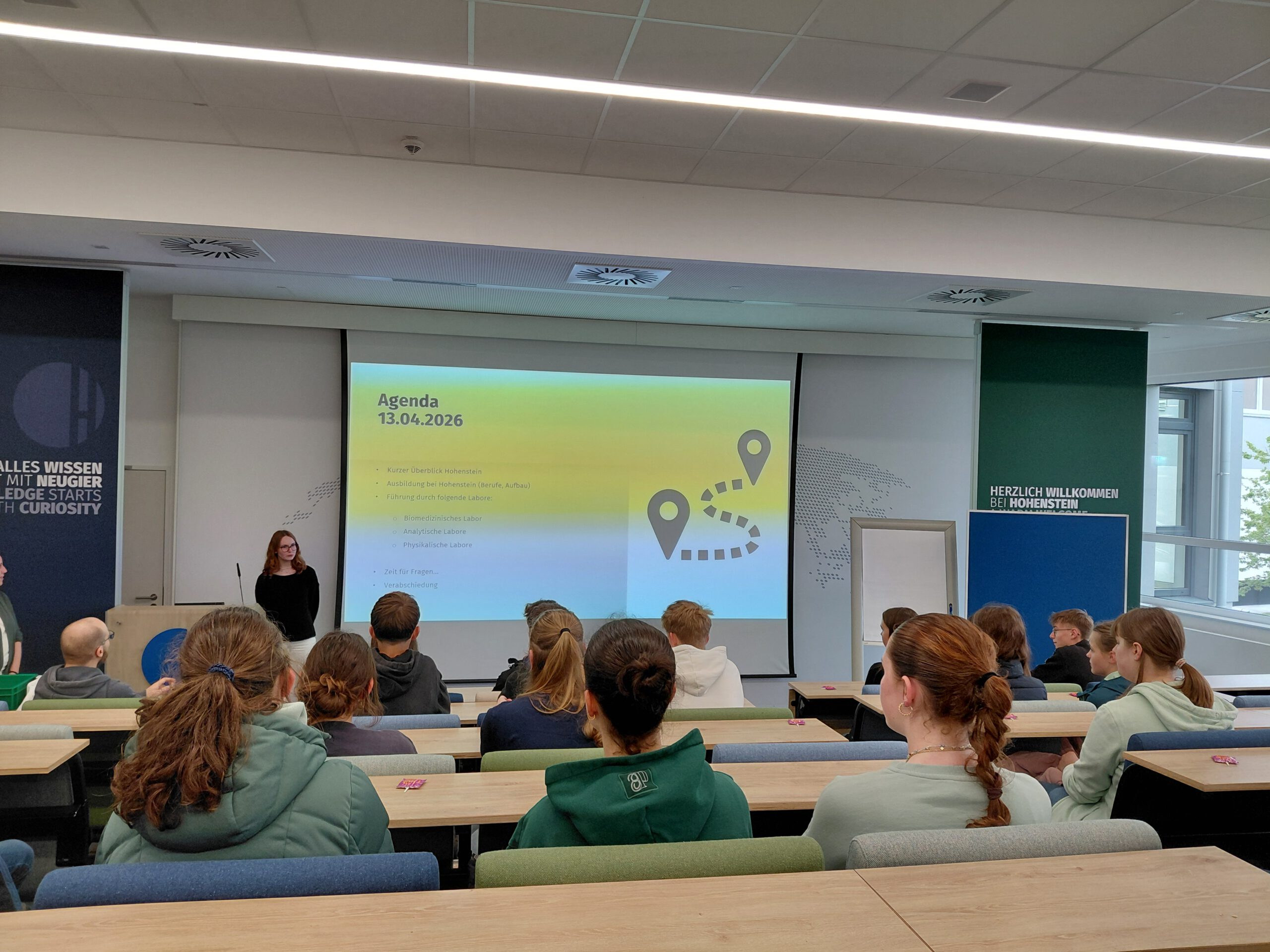 Zum bereits dritten Mal öffneten die Hohensteiner Institute ihre Tore für eine Schülergruppe des AAG. Zuerst wurden das Unternehmen und die angebotenen Ausbildungsberufe durch eindrucksvolle Imagefilme und Kurzvorträge vorgestellt: