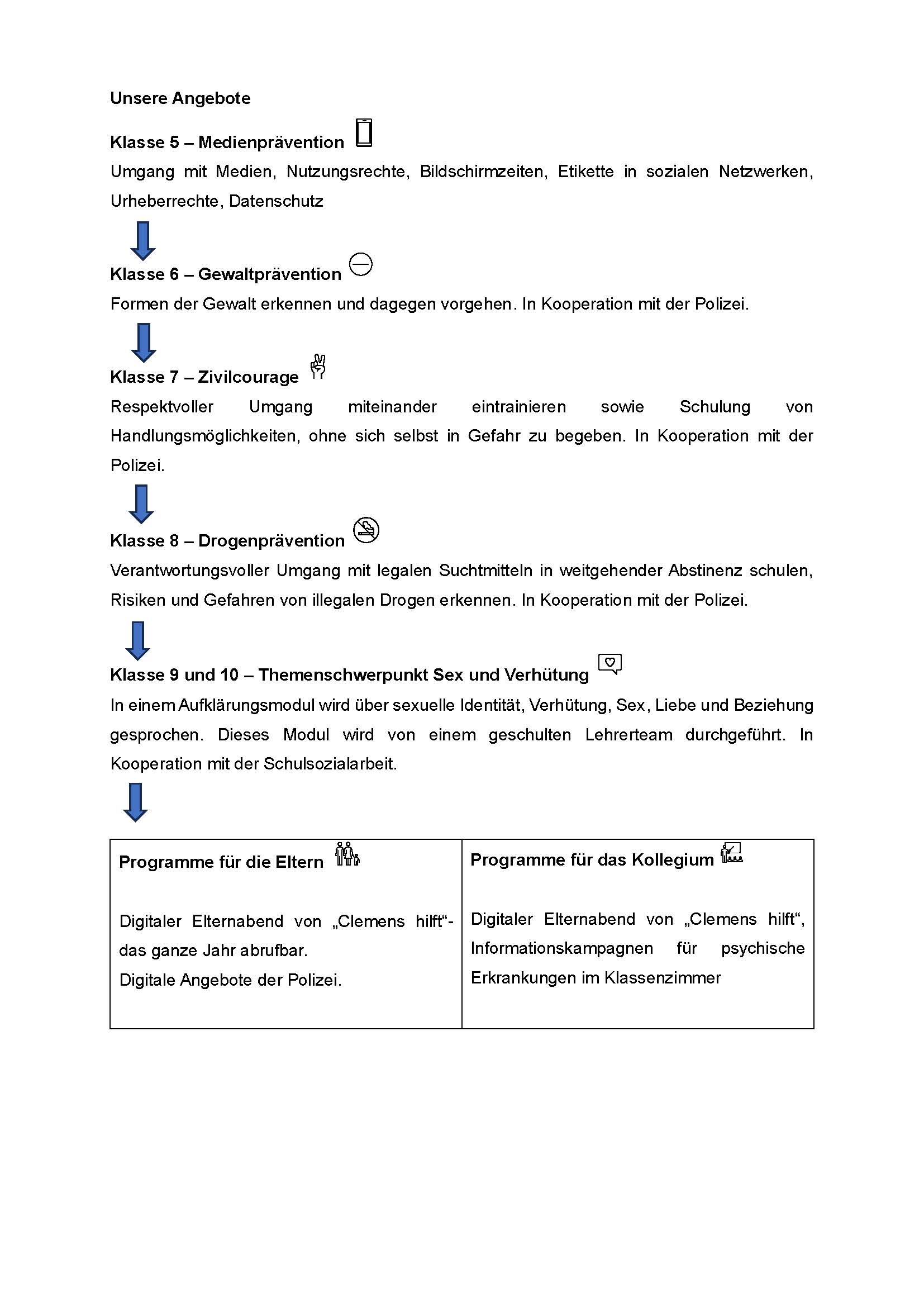 Präventionsprogramme an Schulen gehören heute fast schon zum Alltag, denn wir begegnen immer häufiger Konfliktsituationen, die sich auf verschiedenen Ebenen zeigen können: im Umgang mit Medien, im sozialen Miteinander, in der eigenen Entwicklung sowie im Umgang mit Drogen und Alkohol. Doch wie kann man diesen Konfliktsituationen begegnen? Wie kann man hier den Betroffenen helfen? Und noch viel wichtiger: wie kann man vorbeugend etwas gegen diese Situationen tun? Uns als Schule ist es besonders wichtig, dass wir unseren Schülerinnen und Schülern gezielt Angebote an die Hand geben, die hier Abhilfe und für vieles ein Bewusstsein schaffen sollen. Zudem ist es uns als Schule ein Anliegen, dass die Präventionsarbeit nicht nur für die Schülerinnen und Schüler stattfindet, sondern auch für Eltern sowie Lehrerinnen und Lehrer Angebote geschaffen werden, sodass die Erziehungsarbeit Hand in Hand geht.
